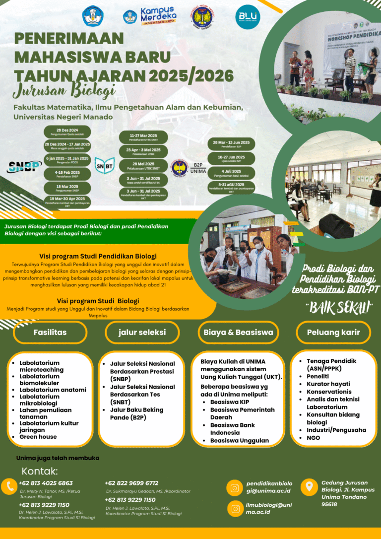 🌱 JADILAH BAGIAN DARI BIOLOGI UNIMA — TEMPAT TUMBUHNYA CAKRAWALA ILMU DAN KARIER!Apakah kamu bercita-cita menjadi pendidik hebat, peneliti, atau praktisi biologi profesional? Inilah saatnya bergabung bersama Program Studi Biologi dan Pendidikan Biologi FMIPA Universitas Negeri Manado yang telah terakreditasi…