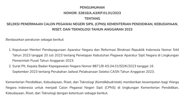 PENGUMUMANNOMOR: 32816 PENERIMAAN CALON PEGAWAI NEGERI SIPIL (CPNS) KEMENTERIAN PENDIDIKAN, KEBUDAYAAN, RISET, DAN TEKNOLOGI TAHUN ANGGARAN 2023 Berdasarkan peraturan sebagai berikut: Kementerian Pendidikan, Kebudayaan, Riset, dan Teknologi (Kemdikbudristek) memberikan kesempatan bagi Warga Negara Indonesia untuk menjadi Calon Pegawai Negeri Sipil…