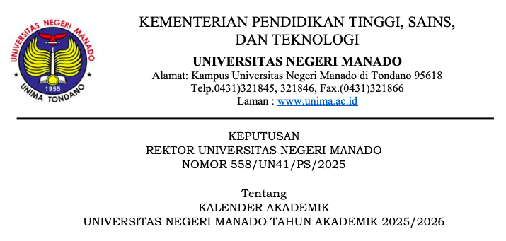Kalender Akademik Universitas Negeri Manado (UNIMA) Tahun Akademik 2025/2026 ditetapkan melalui SK Rektor Nomor 558/UN41/PS/2025 dan berlaku sejak 1 Juli 2025 hingga 30 Juni 2026. Kalender ini menjadi pedoman resmi pelaksanaan seluruh kegiatan akademik di lingkungan UNIMA, mulai dari penerimaan…