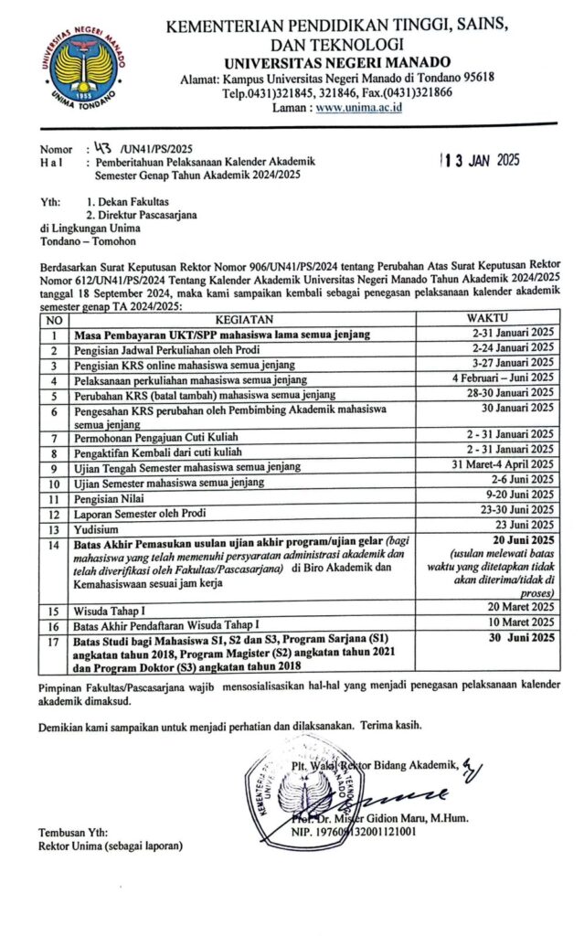 Berdasarkan Kalender Akademik Semester Genap Tahun Akademik 2024/2025, maka disampaikan hal-hal berikut: