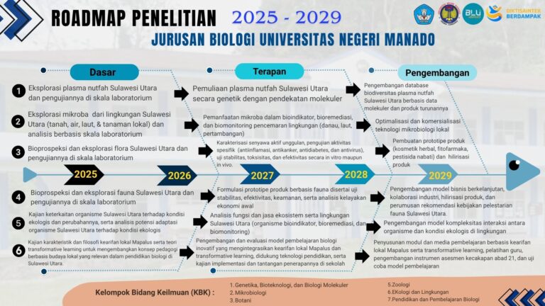 Sebagai bagian dari upaya penguatan tridharma perguruan tinggi, Jurusan Biologi FMIPAK Universitas Negeri Manado merancang Roadmap Penelitian Tahun 2025–2029 sebagai arah strategis dalam mengembangkan kegiatan riset yang berkualitas, terarah, dan berdampak langsung bagi masyarakat serta lingkungan Sulawesi Utara.