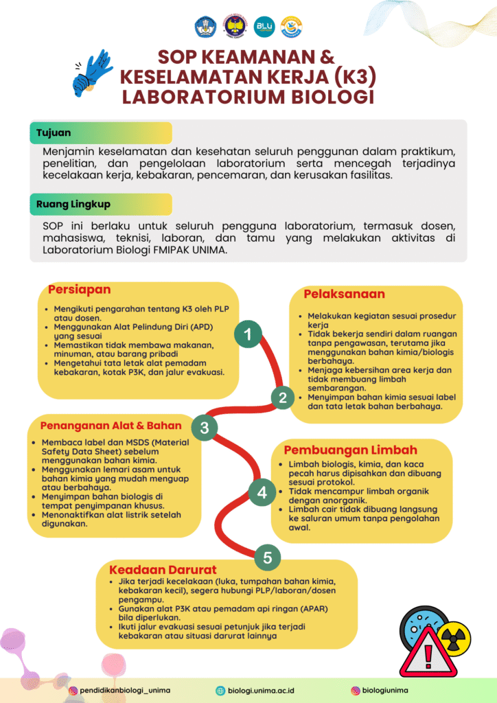 SOP Keamanan dan Keselamatan Kerja (K3) di Laboratorium Biologi disusun untuk memastikan setiap aktivitas laboratorium berlangsung dengan aman dan meminimalkan risiko kecelakaan kerja. Mahasiswa, dosen, dan tenaga laboratorium wajib memahami dan menerapkan prosedur K3 sebagai bentuk tanggung jawab terhadap diri sendiri, orang lain, serta lingkungan kerja di laboratorium.
