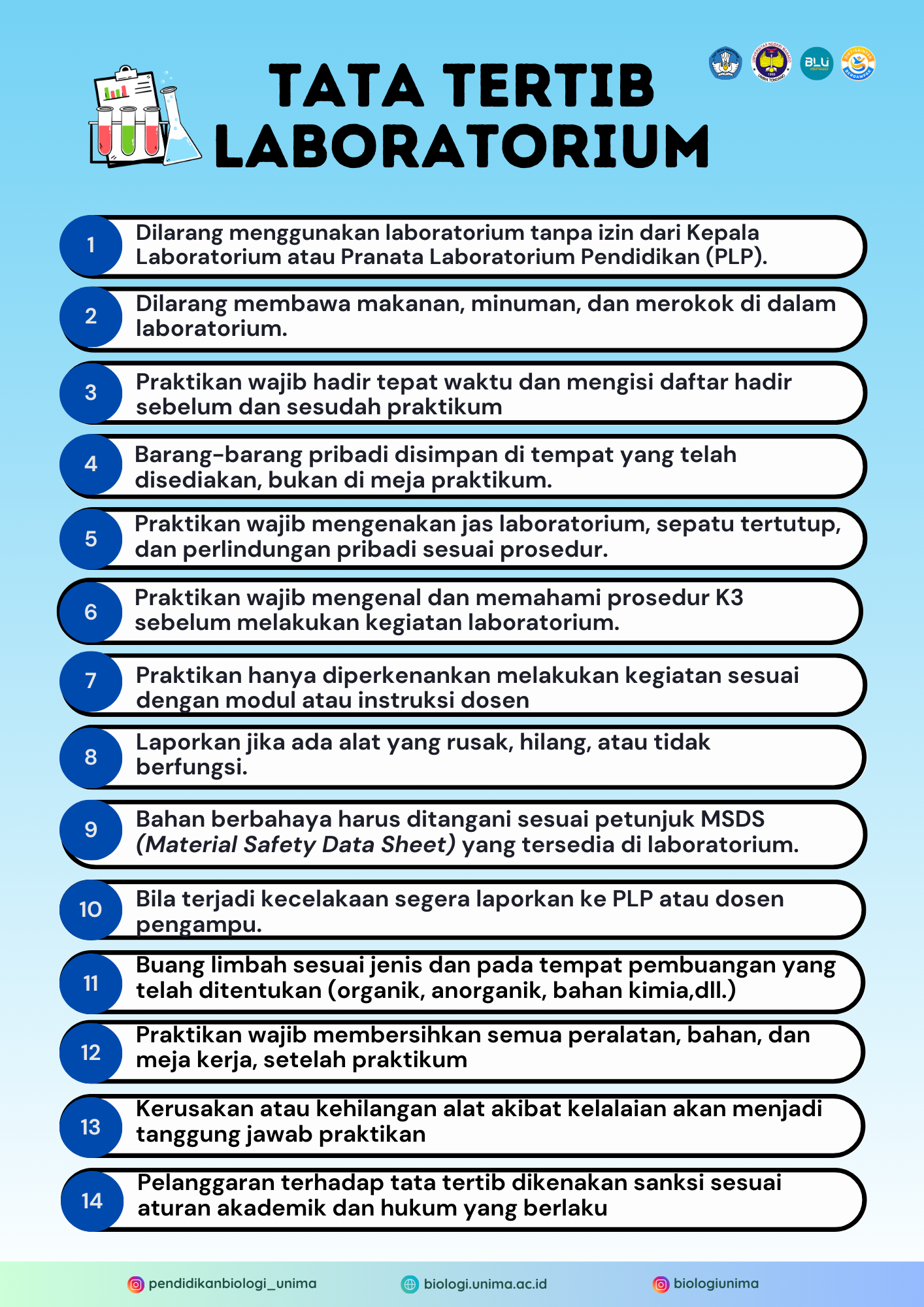 Tata tertib praktikum di Laboratorium Biologi dibuat sebagai pedoman bagi praktikan agar kegiatan praktikum berlangsung tertib, aman, dan sesuai prosedur. Setiap peserta praktikum wajib membaca dan mematuhi aturan yang berlaku selama berada di laboratorium, termasuk ketentuan penggunaan alat, keselamatan kerja, dan etika selama kegiatan berlangsung.